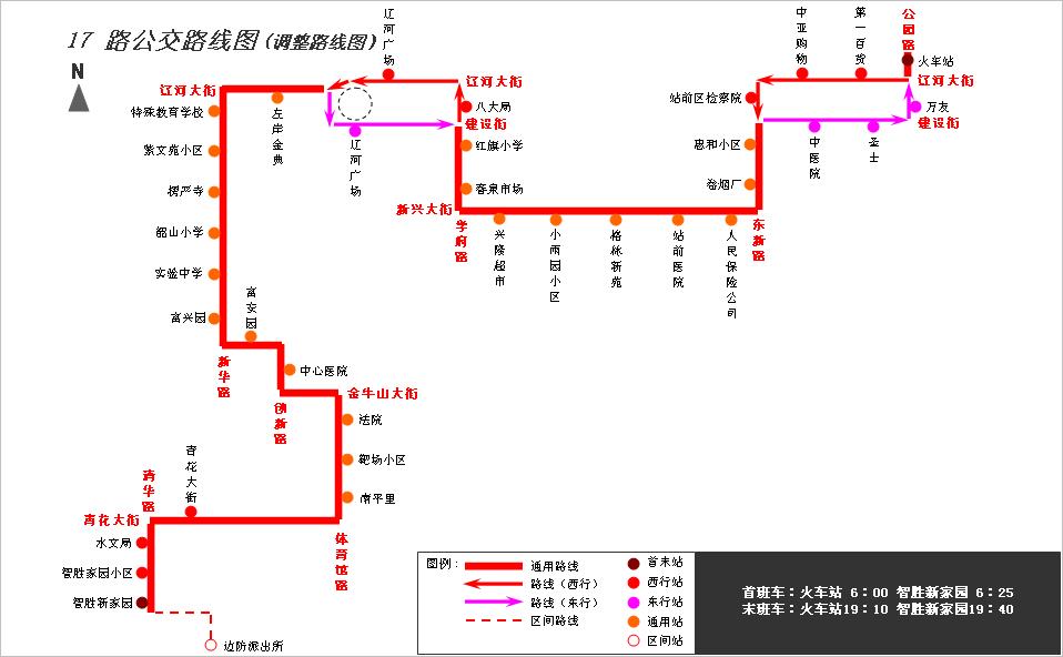 停用17路東風路沿線“公汽公司”、“大潤發(fā)超市”及“人民保險公司”站位;新華路沿線“紫竹院小區(qū)”雙向站位,“鑫牛市場”西行站位;小循環(huán)路段“市委黨校”、“信訪局”西行站位,“鑫牛市場”、“靶場小區(qū)”東行站位;