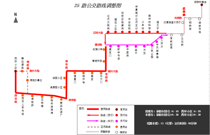 1.線路走向:“西環(huán)小區(qū)”—原線—遼河大街/建設(shè)街(東風(fēng)路)—“立交橋”—莊林路—沈營路—“鋼鐵村委會”。