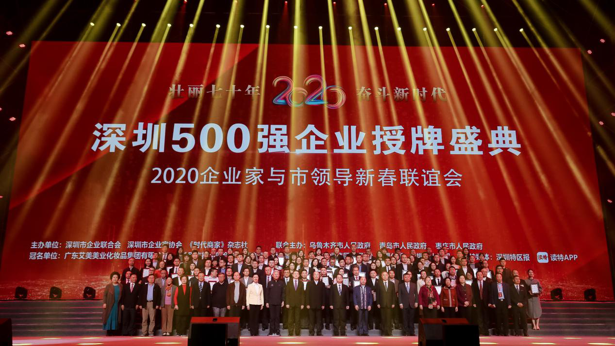 2019年12月10日,由深圳市企業(yè)聯(lián)合會、深圳市企業(yè)家協(xié)會、《時代商家》雜志社主辦的“深圳500強企業(yè)授牌盛典暨2020企業(yè)家與市領(lǐng)導(dǎo)新春聯(lián)誼會”在深圳灣體育中心“春繭”體育館舉行。深圳市人大常委會主任駱文智,市政協(xié)主席戴北方,中國企業(yè)聯(lián)合會、中國企業(yè)家協(xié)會常務(wù)副會長兼理事長朱宏任,深圳市委常委、統(tǒng)戰(zhàn)部部長林潔,副市長王立新及省市老領(lǐng)導(dǎo)等出席了盛典,并為“2019深圳500強企業(yè)”和“2019年度深圳市民營領(lǐng)軍骨干企業(yè)”授牌。